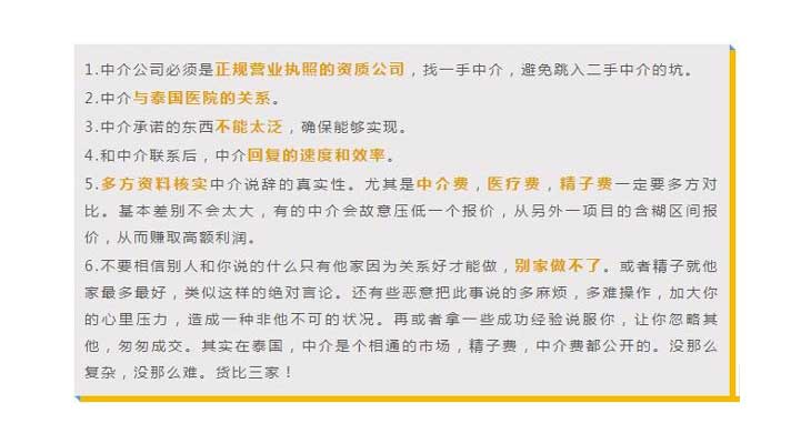 但国内有不少泰国试管婴儿中介服务机构良莠不齐,媒体也报道了很多消费陷阱,特别对于成功率出其高、条件异常优厚的机构,需要自己多比较多鉴定。dRV育儿资讯网-育儿常识全方位解读,助您开启好孕之旅