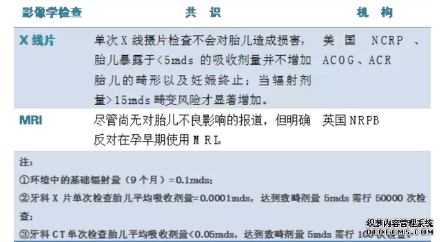 ●妊娠期妇女应尽量避免腹部X线检查,口腔X线检查范围相对较局限,剂量相对较小,安全性相对较高,在无法避免的情况下,应做好防护工作,尽量减小射线的影响。