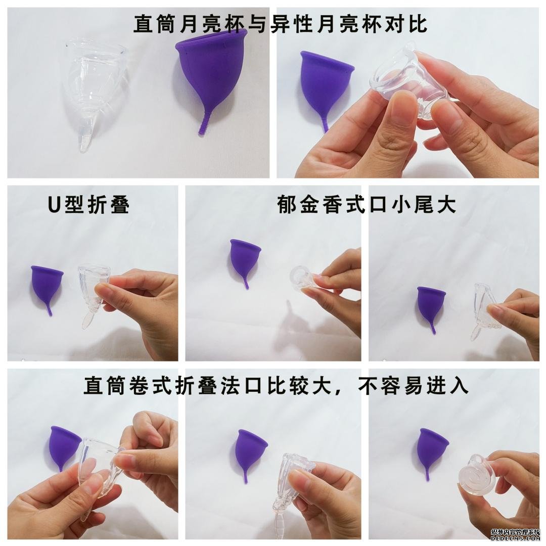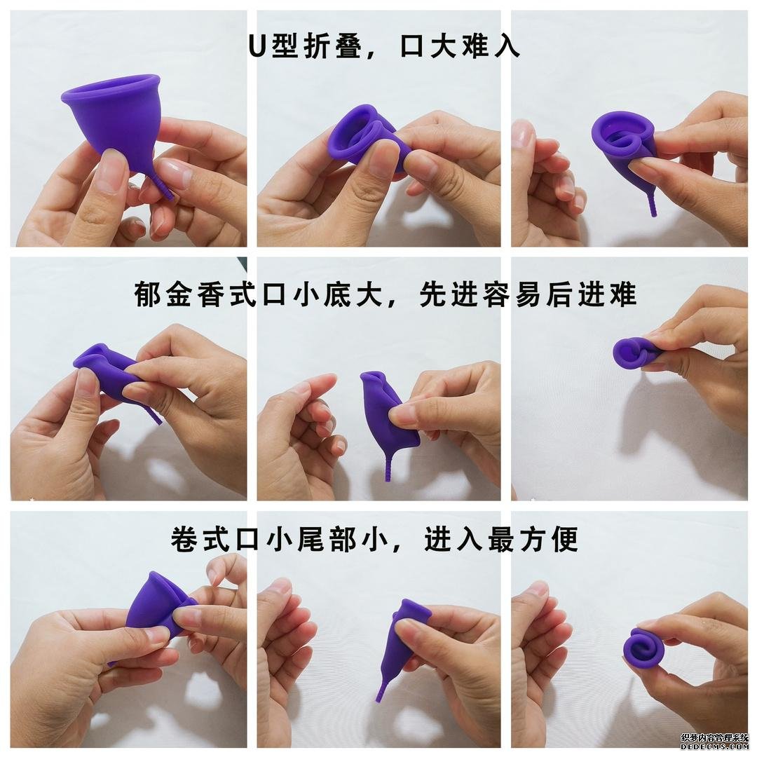 推荐卷起杯口,这样先进去的杯口也是很小的(杯身和杯尾比杯口还要小),杯口进入后往前推,杯壁杯尾毫无压力就全部进去了。但是直筒状的月亮杯杯口卷起来是很大一个圈,只有德国的Funfactory和国内RainCup的是贴合宫颈的异形设计,杯口卷起来才会很小,方便使用。