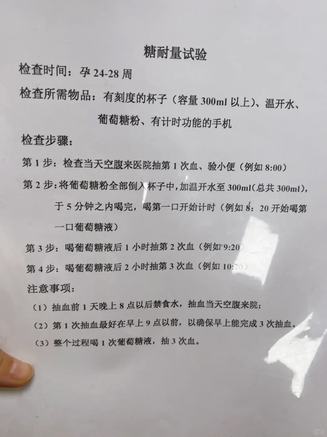 以早点去早点结束,医院上午一般11点30下班 在这之前要抽完三次血,最好8点前就到医院2. 糖水不要一口闷 容易晕 慢慢喝 5分钟内喝完就行
